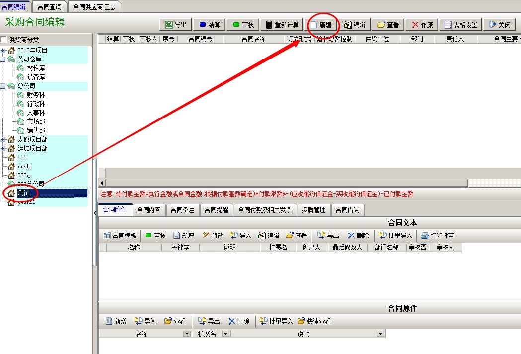 打開采購合同,左側選擇相應的項目,右邊點新建,錄入采購合同相關信息,保存。