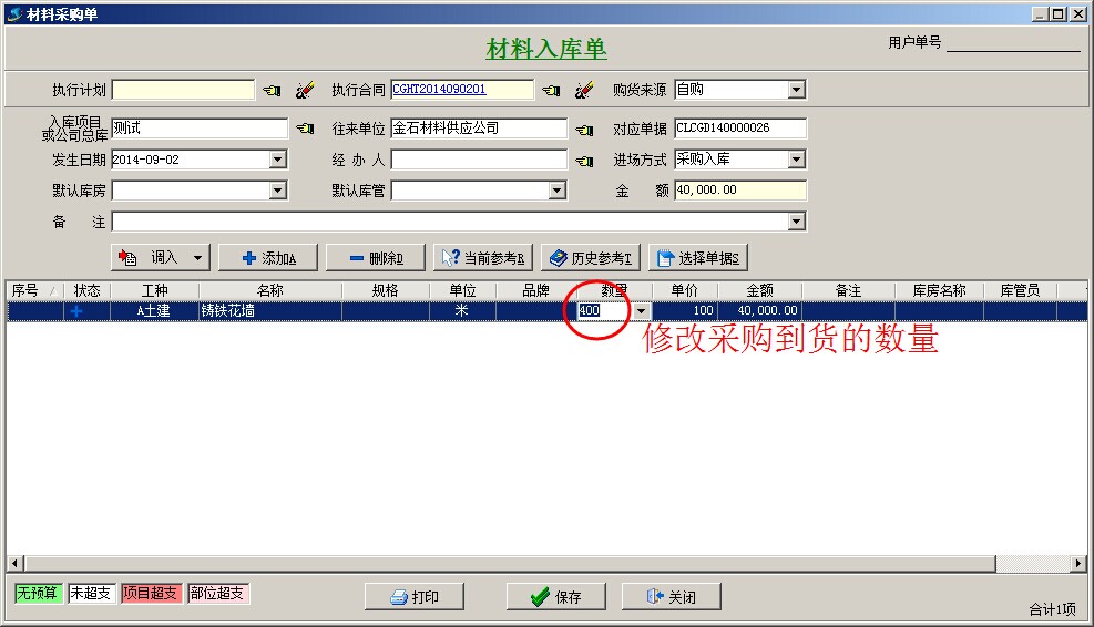 ②執行驗收(或驗收一部分):做【材料入庫單】(或叫【材料驗收單】)。