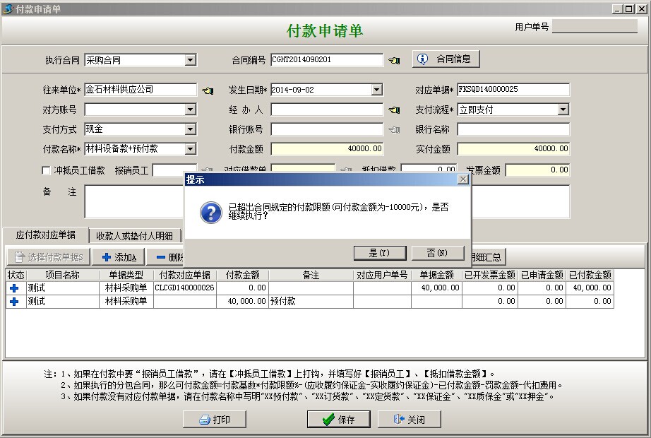 注:上圖所示;付款申請單的兩行明細為兩個材料采購單,第一行的[付款對應單據]為CLCGD140000026已付款金額40000已經等于單據金額(表示該采購單已經付完,是通過上一個付款單自動對應上的付款數),所以付款金額為0,第二行的[付款對應單據]為空,表示本項支付的款項為預付款),上面的付款名稱為材料設備款+預付款;
