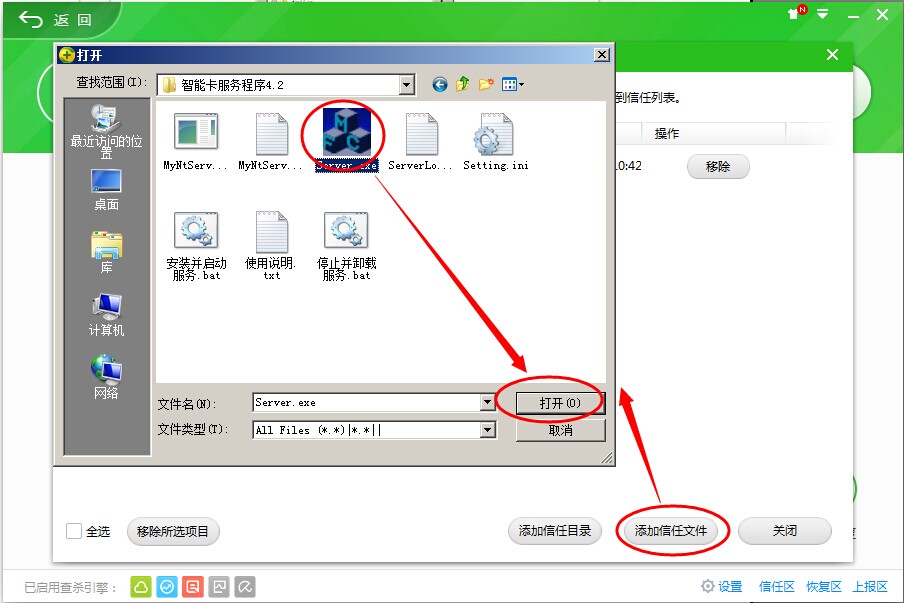 信任目錄添加完成,然后點擊添加信任文件,找到加密鎖服務程序文件夾打開,找到