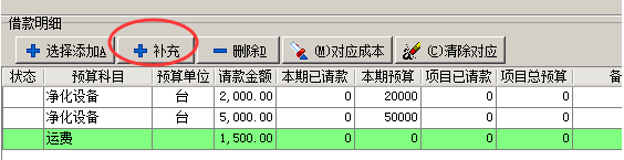 在請款過程中, 如果出現(xiàn)預(yù)算以為的請款,如:運費、裝卸費等,可以利用補(bǔ)充按鈕來進(jìn)行補(bǔ)充。