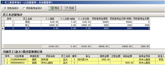 付款申請單填寫完畢后,需要多級審核通過,審核通過后由財務(wù)執(zhí)行生產(chǎn)付款單,當(dāng)付款單生成完畢后,我們可以查看員工借款單統(tǒng)計,其中趙大的借款中,報銷一欄出現(xiàn)8500,,說明已經(jīng)報銷完畢。如下圖: