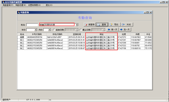 輸入“區域名稱”或者“關鍵字”,點擊“查詢”按鈕可查詢考勤信息,“卡號識別碼”是手機卡號的唯一識別碼,當“卡號識別碼”顯示異常時可檢查是否存在作弊行為,系統自動定位用戶的簽到地址,若簽到信息正常可根據簽到時間在“考勤值”輸入框中輸入對應的考勤值(若同一用戶一天內多次考勤只在最后一次輸入考勤值),如圖: