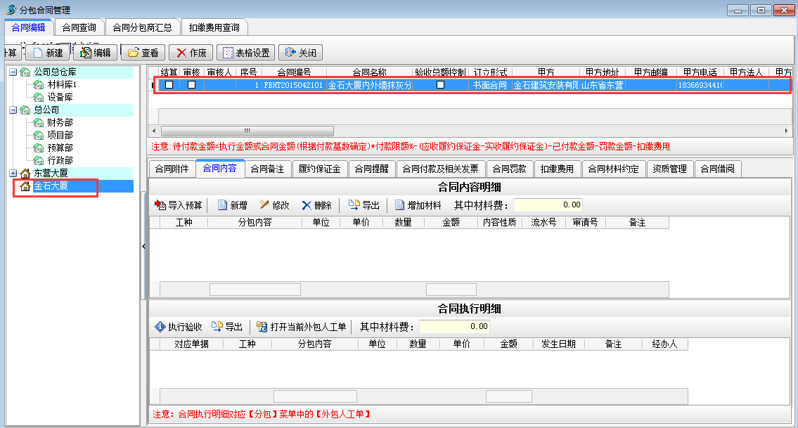 在【合同編輯】中左半部分是合同的分類,分包合同也是按【項目維護】進行分類管理的。一個項目下可以建立多個合同,窗口的右上部分是合同列表,一行信息代表一個合同。右下部位是當前合同相關的內容:【合同附件】、【合同內容】、【合同備注】、【履約保證金】、【合同提醒】、【合同付款及相關發(fā)票】、【合同罰款】、【扣繳費用】、【合同材料約定】、【資質管理】、【合同借閱】。