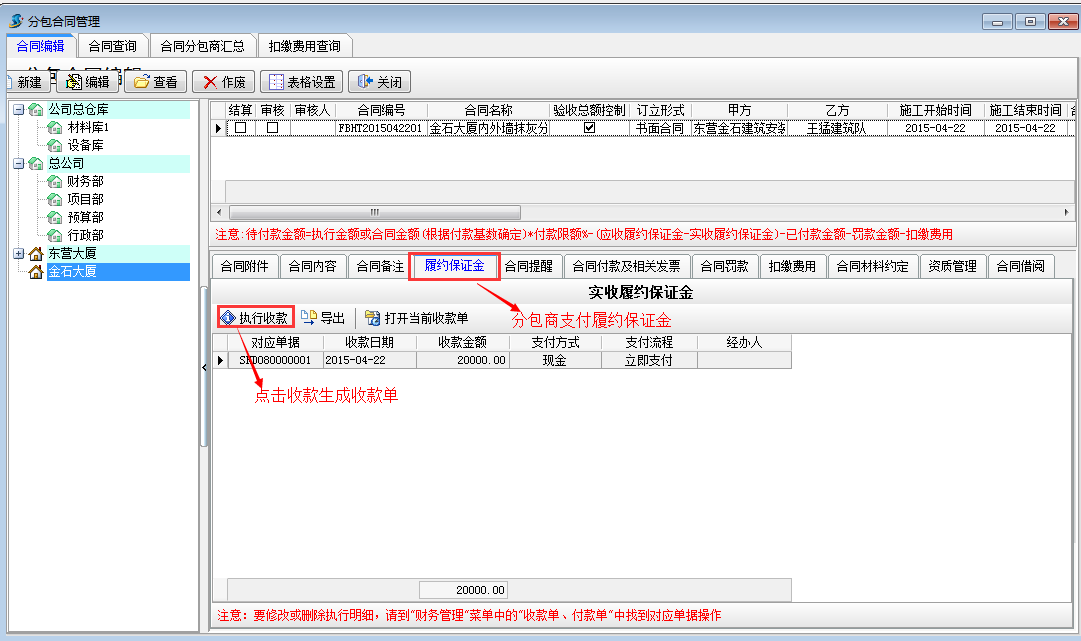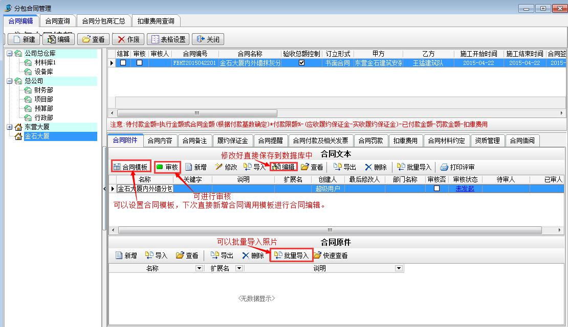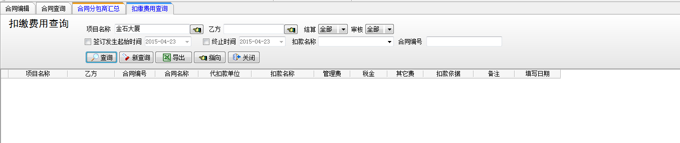 工程項目分包管理合同 是與分包商或施工隊簽訂的合同,包括【合同編輯】、【合同查詢】、【合同分包商匯總】、【扣繳費用查