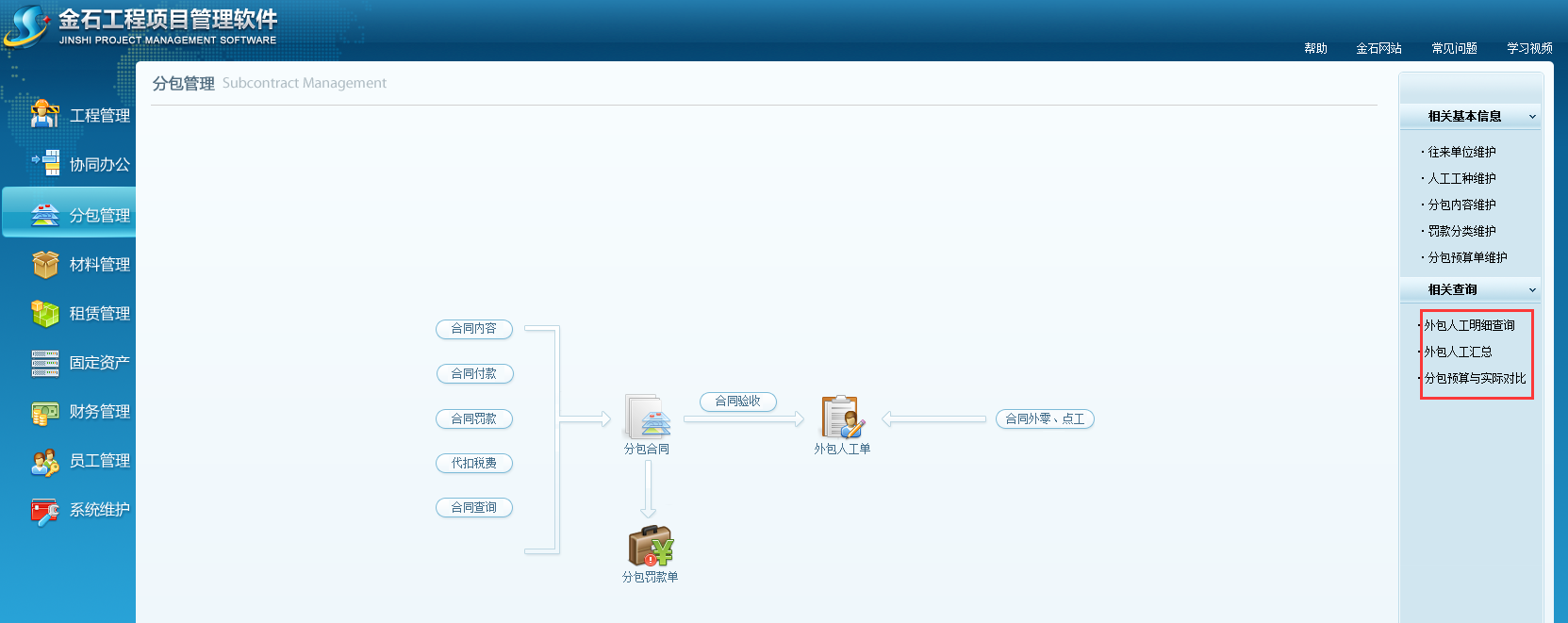 在做工程項目分包管理之前要做好往來單位維護,人工工種維護,分包內容維護,罰款分類維護,分包預算單維護。