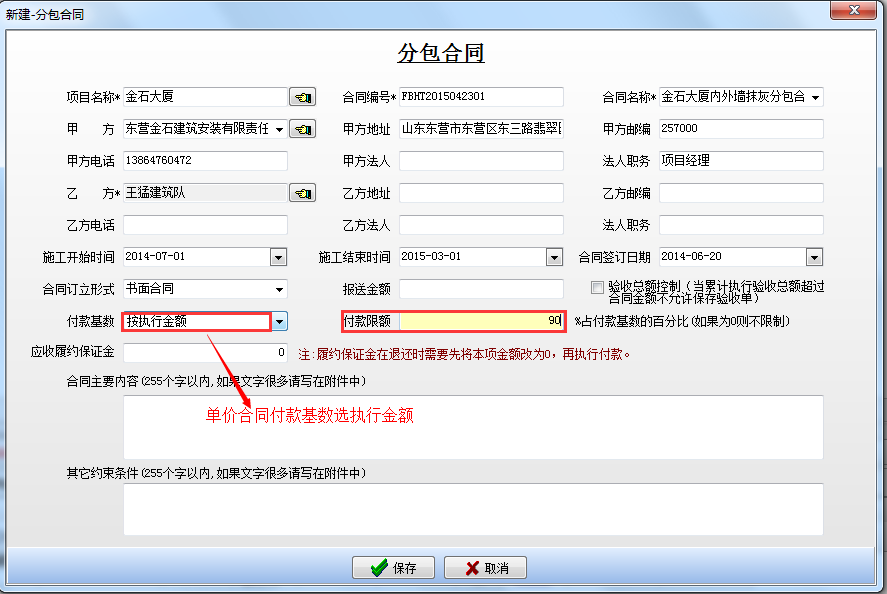 其中付款基數為兩種方式:1、按合同金額 2、按執(zhí)行金額(大部分用戶都應該使用該選項,據實結算)。