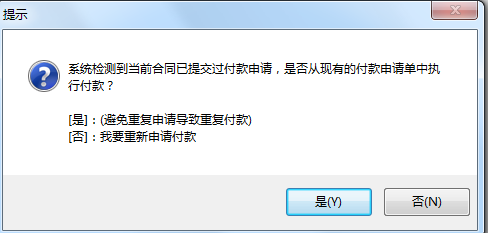 在合同付款及相關發(fā)票處點擊付款生成付款申請單,系統會自動提示你已有預付款。