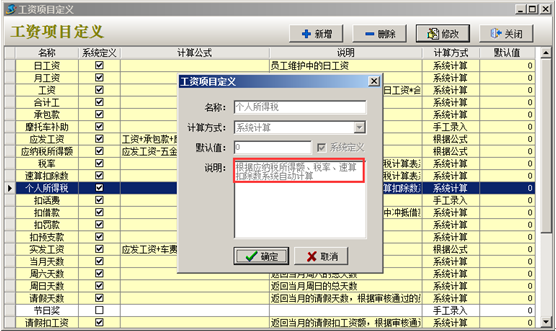 工程項(xiàng)目管理軟件中“五金基數(shù)”及“個(gè)人所得稅”在工資項(xiàng)目定義中設(shè)置好之后,在生成工資表時(shí)系統(tǒng)會扣除對應(yīng)金額。如圖:
