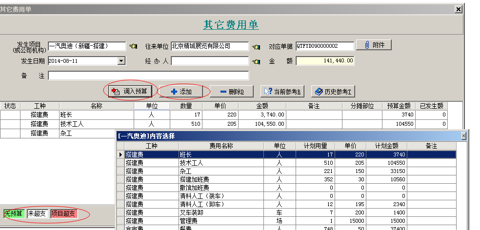 在單據(jù)中我們可以使用添加【按鈕】進(jìn)行添加,也可以使用【調(diào)入預(yù)算】功能,從預(yù)算里面調(diào)入。另外在單據(jù)中有預(yù)警機(jī)制,如果添加預(yù)算外的內(nèi)容就明細(xì)會(huì)顯示綠色,超過預(yù)算的就會(huì)明細(xì)顯示紅色。