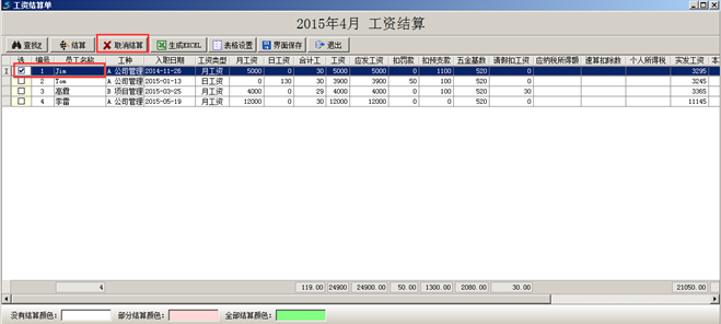 注:如果員工的工資只做了部分結算,則會顯示對應的“部分結算”的顏色。
