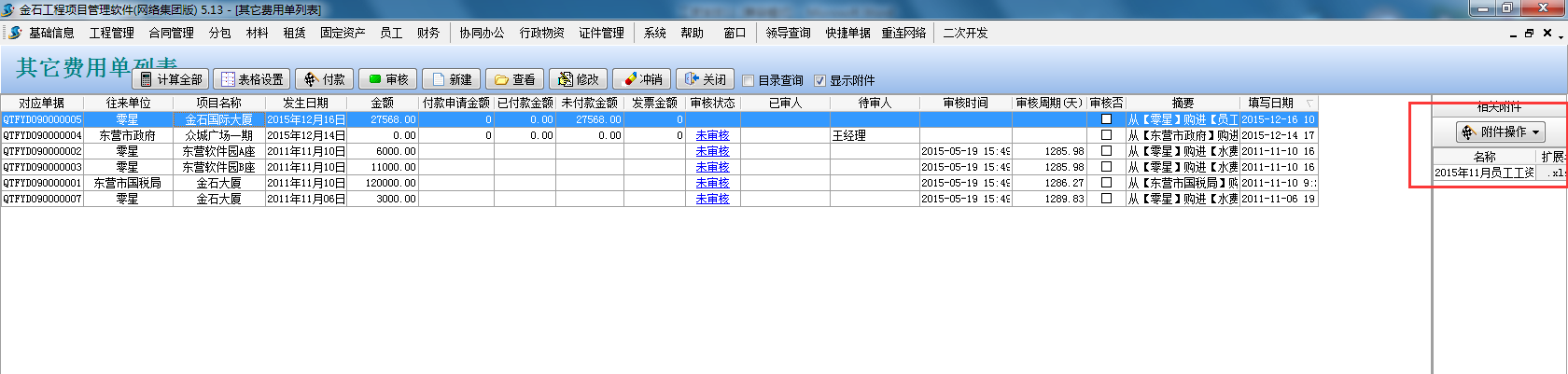 使用工程管理軟件【財務管理】-【其他費用單】記錄員工工資合計,詳細的excel工資表可導入到其他費用單單據附件中。如下圖: