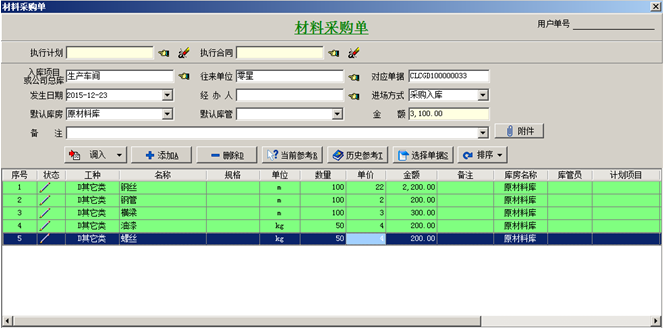 工程管理軟件中采購原材料到庫房做材料采購單,入庫庫房選擇生產車間的庫房。如圖: