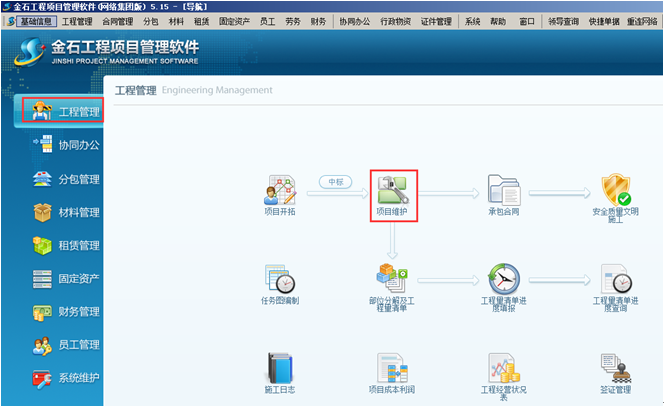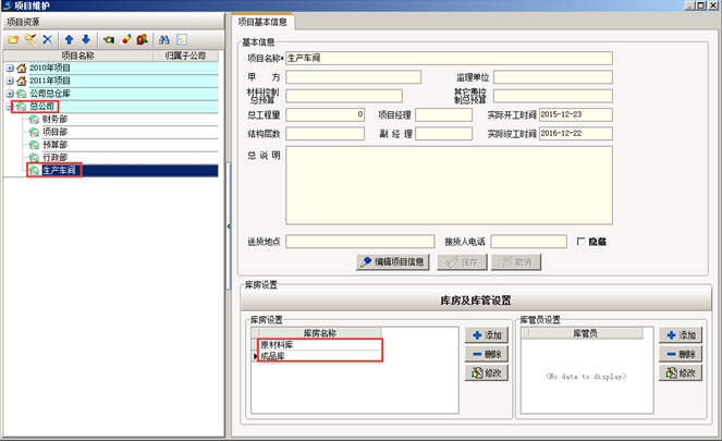 首先在金石工程管理軟件“工程管理”的“項目維護”中,在公司節點下建立“生產車間”并設立對應庫房,這樣便于對用于生產的原材料或者產品進行管理。如圖: