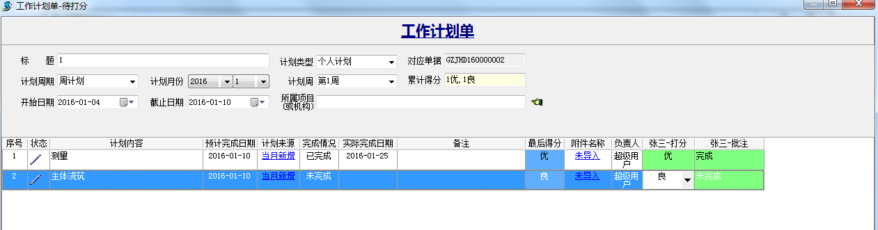總結完成,狀態顯示評定中,打分人可以對該工作計劃進行打分。打分之前首先設置打分規則。