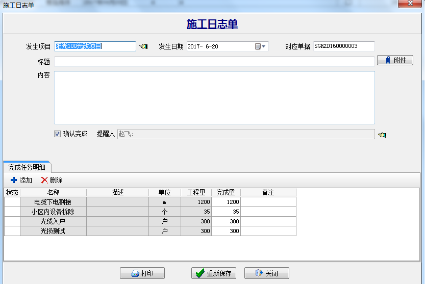 3、派工人員根據完成情況進行施工日志填報,“確認完成”打鉤可設置提醒人查看