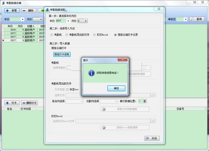 選擇微信云端打卡記錄,點擊微信打卡讀取,等待獲取,獲取結束后,提示完成,如下圖,