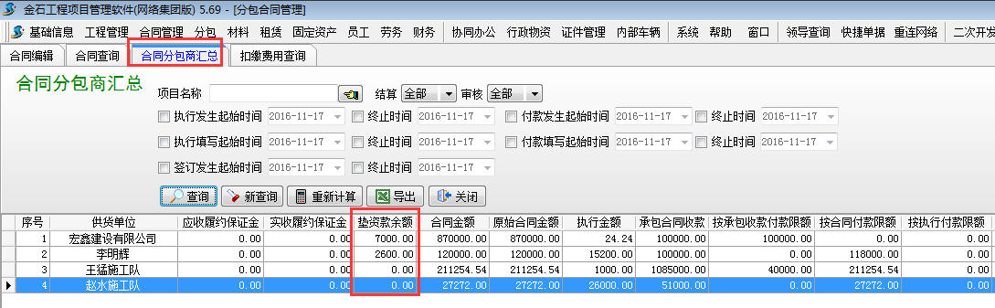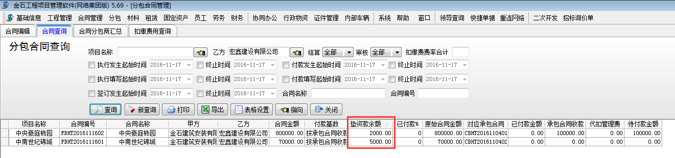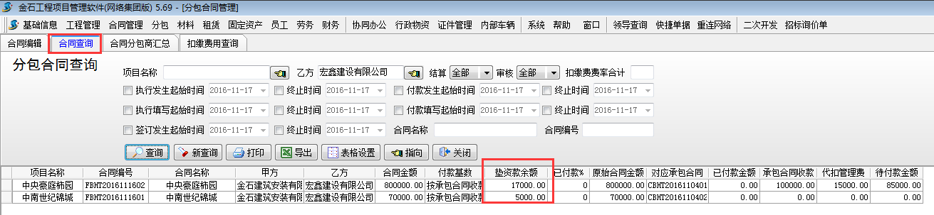 3.2 按合同查詢各合同墊資款余額。可以在【分包合同】-【合同查詢】處查詢。