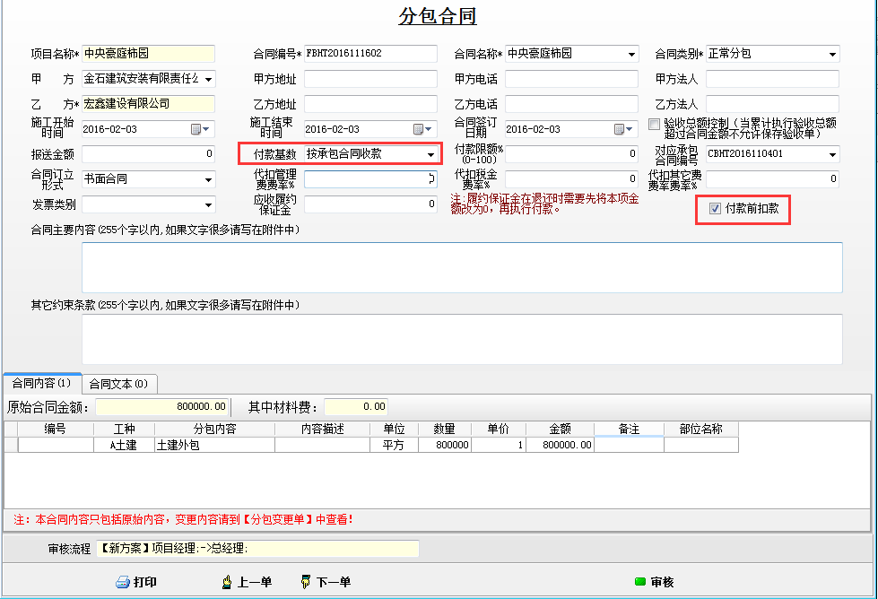 在建立分包合同時可選擇在“付款前扣款”處打鉤,這樣在付款前,必須做扣繳費(fèi)用才能付款,避免有忘記扣款的情況。具體參見文章“分包合同付款前扣款的使用”index.php?c=msg&id=1529&