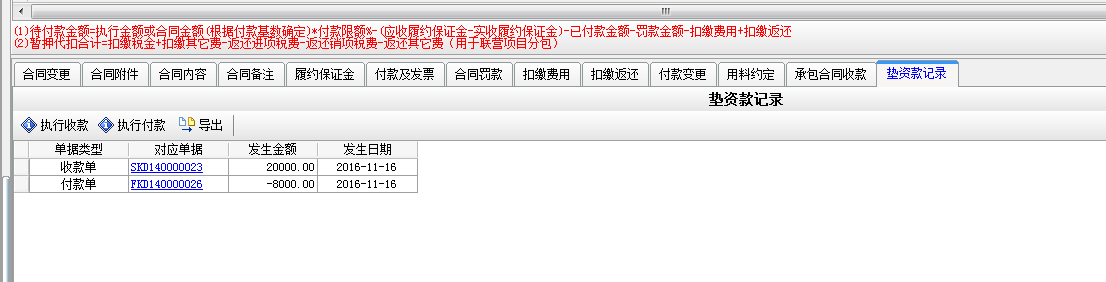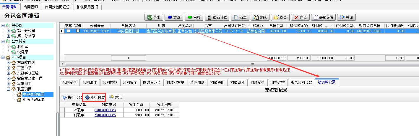 在【分包合同】-【墊資款記錄】處選擇執(zhí)行付款,或者在【財務(wù)管理】-【付款單收款單】新建付款單選擇墊資款付款。