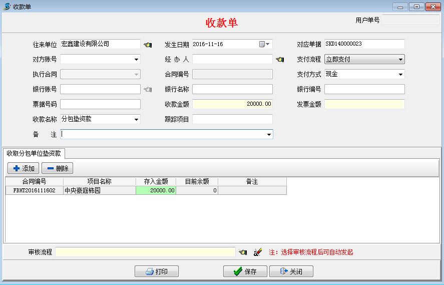 在工程項目管理軟件【分包合同】-【墊支款記錄】處選擇執(zhí)行收款,或者在【財務(wù)管理】-【付款單收款單】新建收款單選擇墊資款收款。
