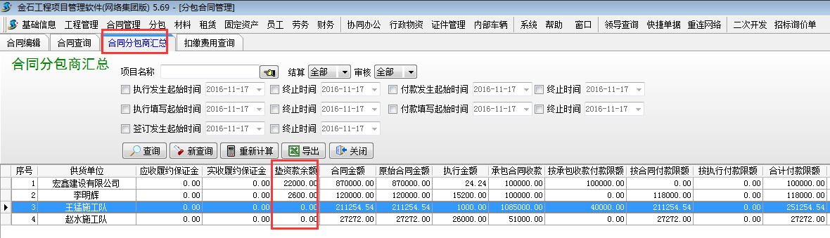 3.1 查詢聯(lián)營單位所有墊資款余額。可以在【分包合同】-【合同分包商匯總】處查詢。