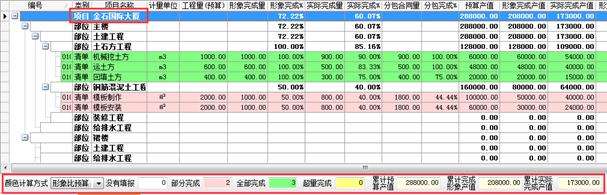 對于某些工程,高水平的項目經(jīng)理可以把實際完成量做小,需要的達(dá)到的效果是“實際干的進(jìn)度小于向甲方上報的進(jìn)度”。在金石軟件中能很好地體現(xiàn)“實際進(jìn)度”、“形象進(jìn)度”兩個概念,在進(jìn)度填報過程中可以將“實際進(jìn)度”、“形象進(jìn)度”分別填報。并且將清單“甲方合同量”、“分包合同量”、“形象完成量”、“實際完成量”四者的關(guān)系完全展現(xiàn)在一起。