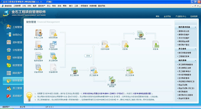 本軟件是金石軟件公司以眾多施工企業(yè)管理現(xiàn)狀為出發(fā)點,深入了解施工現(xiàn)場,經(jīng)過七年地不斷完善與努力,打造成為一款成熟、靈活、實用性極高的信息化內(nèi)控管理平臺。軟件以成本控制為核心,以資金管理為主線,全面解決項目管理難題,提升項目管控能力。對工程的投標(biāo)管理、中標(biāo)后的進(jìn)度管理、分包管理、采購招標(biāo)、材料管理、租賃管理、固定資產(chǎn)管理、員工管理、勞務(wù)管理、資金管理、押金管理、發(fā)票管理、稅金核算、聯(lián)營管理、文檔資料管理、物資管理、安全質(zhì)量管理、證件管理、車輛管理、工程結(jié)算、等進(jìn)行全方位管理,并提供強大的OA功能,能夠?qū)崿F(xiàn)各部門之間的數(shù)據(jù)共享及業(yè)務(wù)單據(jù)網(wǎng)上簽批審核。并且提供了強大的自定義工作流驅(qū)動和各種流程開關(guān),企業(yè)可根據(jù)自己情況自行設(shè)定,從而規(guī)范企業(yè)管理、讓工作流程正歸化、簡單化。通過工作流,讓信息送審、審批更貼近日常公司管理模式,申請人可隨時看到當(dāng)前業(yè)務(wù)的審批進(jìn)度和各領(lǐng)導(dǎo)的審批意見。