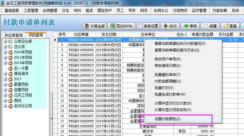 1、升級施工管理軟件最新版后,“財務管理”→“付款申請單列表”點擊鼠標右鍵,選擇“設置付款顏色”