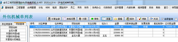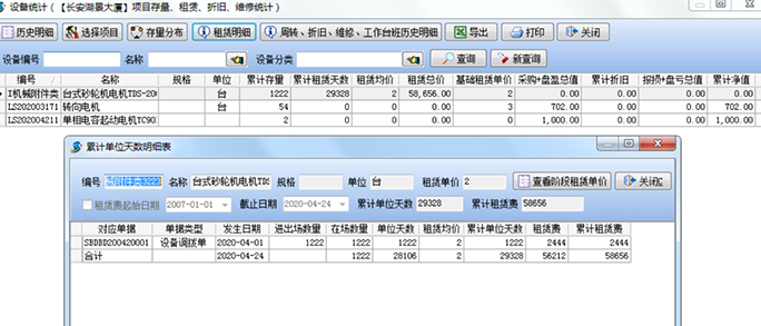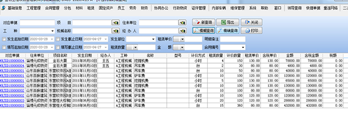 同時(shí),已經(jīng)生成的各種信息,可以在【外包機(jī)械明細(xì)查詢】模塊查詢所有的機(jī)械往來明細(xì)。