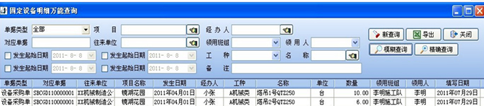 每日的信息也將在系統(tǒng)中自動(dòng)匯總,形成固定設(shè)備明細(xì)萬能查詢,可以說是固定設(shè)備使用的總賬。