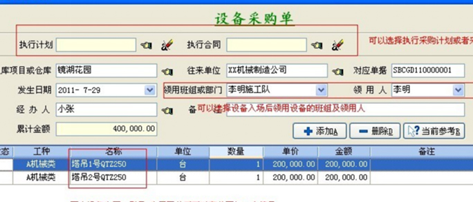 在使用機(jī)械設(shè)備的過程由于老化、意外事故等情況,需要重新采購(gòu)設(shè)備。那么可以執(zhí)行設(shè)備采購(gòu)合同,設(shè)備的基礎(chǔ)信息可以直接從合同中導(dǎo)入。