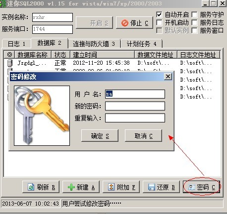在服務(wù)器端,到第二選項卡數(shù)據(jù)庫中,在右下角有一個修改密碼按鈕,