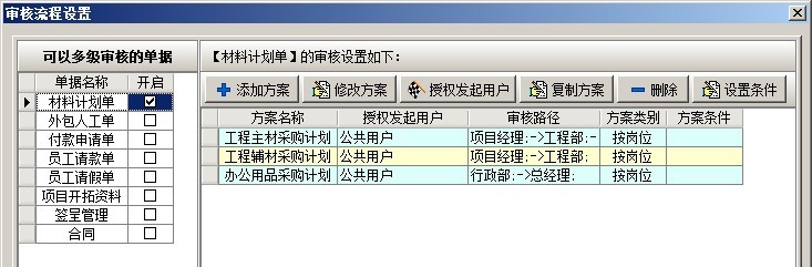 在多級(jí)審核中,可以設(shè)置多套審核方案,每套方案可設(shè)置多個(gè)崗位,可設(shè)置方案的授權(quán)發(fā)起用戶(在業(yè)務(wù)單據(jù)中選擇該審核方案的用戶)。在添加方案時(shí),有三種方式逐級(jí)審核、平級(jí)審核、跨級(jí)審核。逐級(jí)審核是指各個(gè)崗位按先后順序依次審核該業(yè)務(wù)單據(jù),例如審核順序?yàn)椋こ滩俊㈩A(yù)算部、經(jīng)營(yíng)部、總經(jīng)理如下圖: