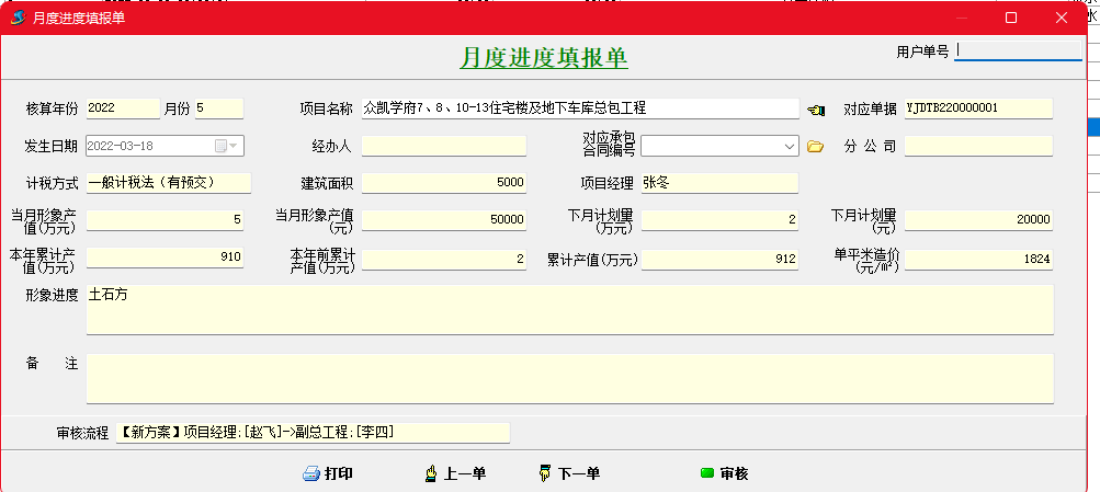 月度進度填報單可以實現按月上報形象產值進度并自動統計當年度產值,總產值以及單平米造價。可以可以根據上報的產值計算待收款以及利潤。