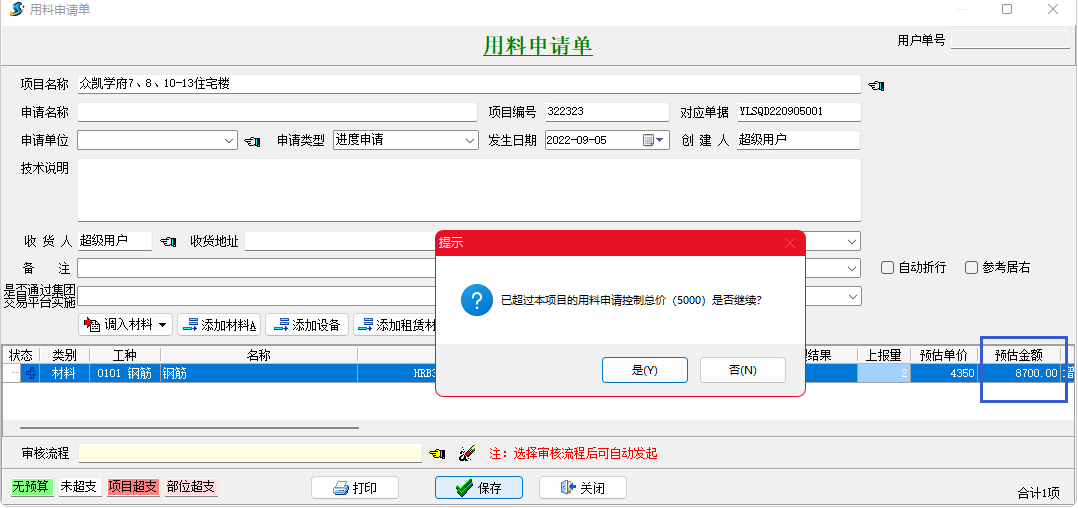 金石工程項目管理軟件項目維護增加用料申請控制功能,用于控制用料申請控制,超出控制金額系統會自動報警。