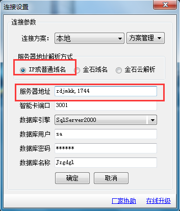 在做連接設(shè)置時直接選擇使用IP或計算機(jī)名稱,不要選擇金石云解析。如下圖是金萬維解析: