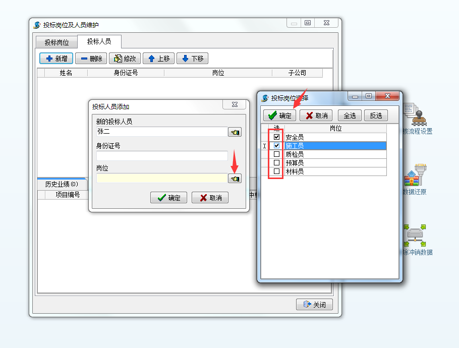 錄入好姓名后,選擇相對應的崗位(選擇崗位時,可以一人設多崗),依次添加好投標人員后,關閉該窗口,如下圖: