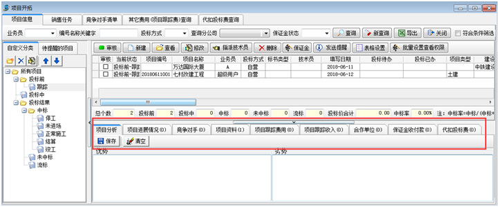 2. 填寫項(xiàng)目開拓的相關(guān)信息記錄(項(xiàng)目分析、項(xiàng)目進(jìn)展情況、競(jìng)爭(zhēng)對(duì)手、項(xiàng)目資料、項(xiàng)目跟蹤費(fèi)用、項(xiàng)目跟蹤收入、項(xiàng)目合作單位、保證金,代扣投標(biāo)費(fèi)等)。