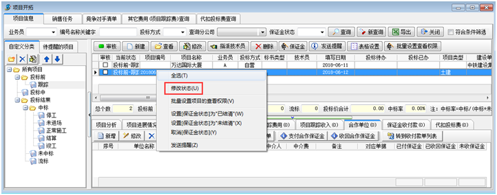 隨著投標(biāo)的進(jìn)度右鍵可以設(shè)置投標(biāo)狀態(tài)