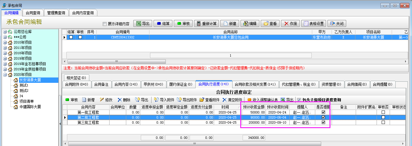 1、在【工程管理】-【承包合同】-合同執行進度,點擊新增,填寫預計收款金額、預計收款時間、提醒人、是否提醒。