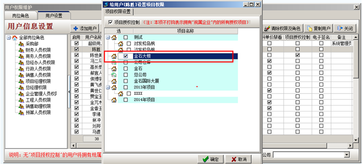 彈出設置項目授權,以陳勝只有金石大樓這個項目的權限進行項目授權