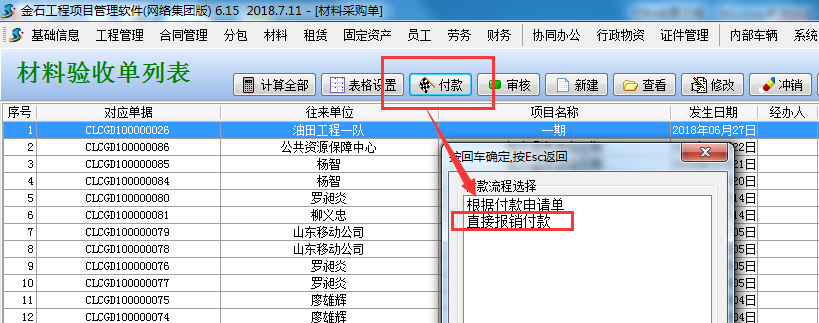 在材料采購單列表中找到需要報銷的單據,選擇“直接報銷付款”
