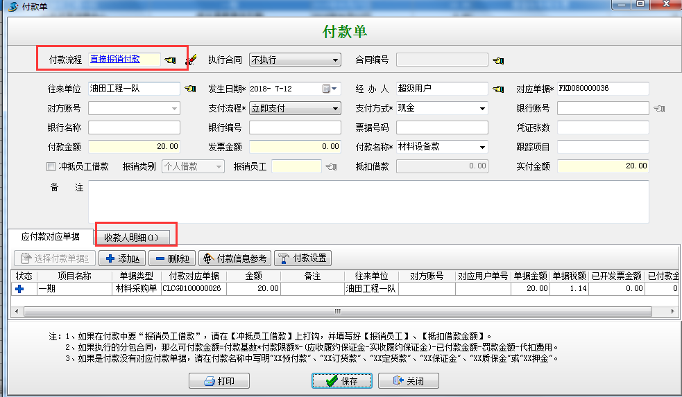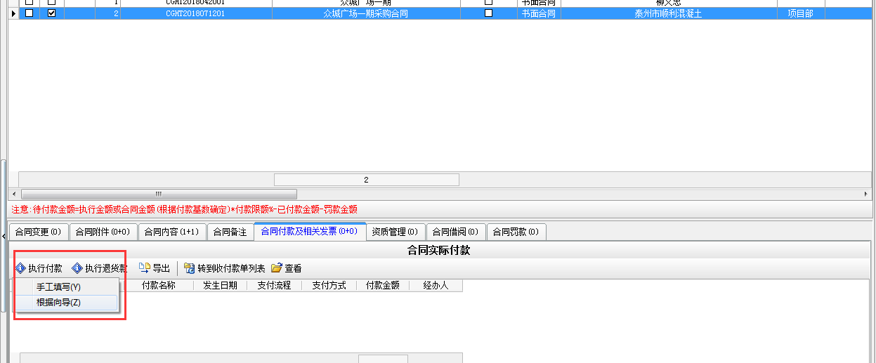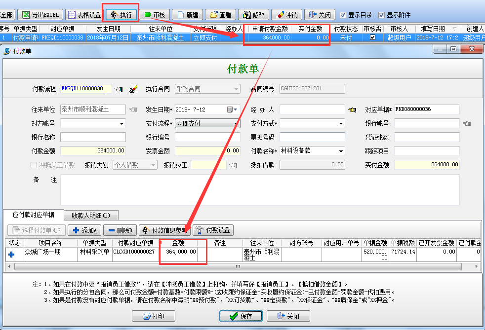 選擇“執行付款”根據向導后系統會自動根據材料單據金額*付款比例,自動得出待付的金額