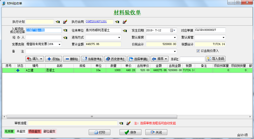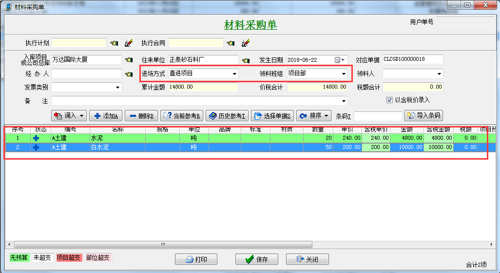 1.項目上沒有采購計劃以及采購合同的情況,可進行直接采購,做工程項目管理軟件采購入庫單采購入庫或直進項目,這種情況適合項目上零星材料的采購。如圖:
