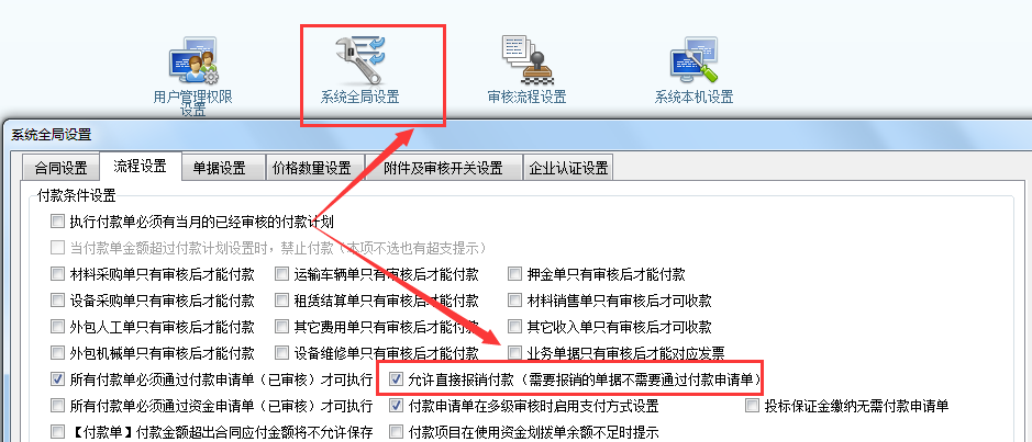 在“系統維護”→“系統全局設置” 開啟“允許直接報銷付款”