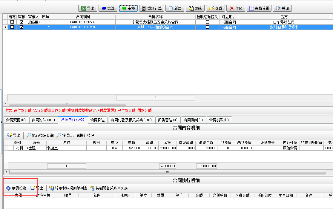 第一步,進入工程項目管理系統的【材料管理】模塊,點擊[采購合同],如圖: