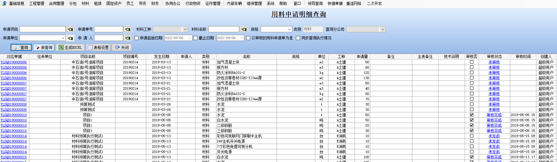 如下圖所示,是用料申請(qǐng)明細(xì)查詢的展示界面。此查詢,可以根據(jù)項(xiàng)目,申請(qǐng)單位,申請(qǐng)人以及具體的材料名稱進(jìn)行篩選查詢,這樣可以精確到某個(gè)項(xiàng)目,某個(gè)申請(qǐng)人所有申請(qǐng)的材料明細(xì),給材料管理人員有力的數(shù)據(jù)支撐,使得材料管理更加嚴(yán)謹(jǐn)和便捷。