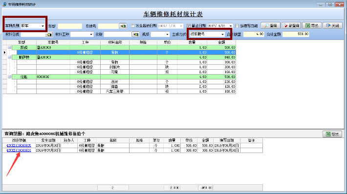 【材料管理】→【其它出庫單】,出庫類別→車輛維修→車牌號