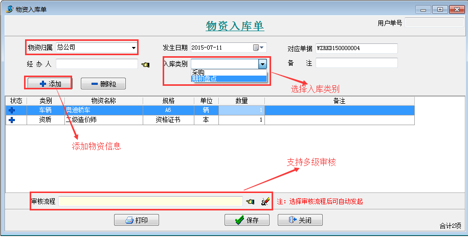 【物資入庫單】是用來登記發(fā)生的物資入庫的單據(jù)。